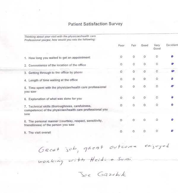 | #21 | 4 | 4 | 3 | 3 | 4 | 5 | 5 | 5 | 5 | Q7: Nurse assist got a 2 or Fair "Nurse assist needs more training on BP's, proper size equipment needed to remove sutures. MD was excellent." |
